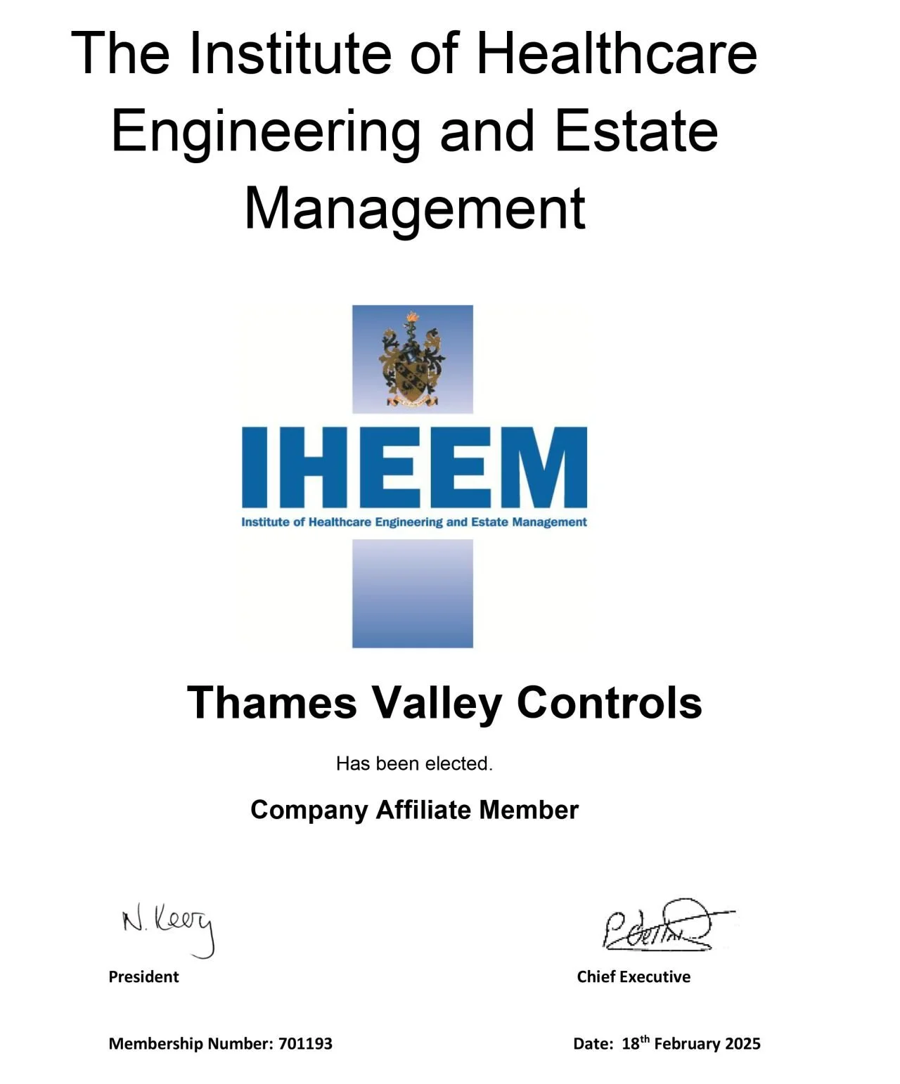 Thames Valley Controls are proud to share that they have been officially awarded the Company Affiliate Member certification by the Institute of Healthcare Engineering and Estate Management (IHEEM)!